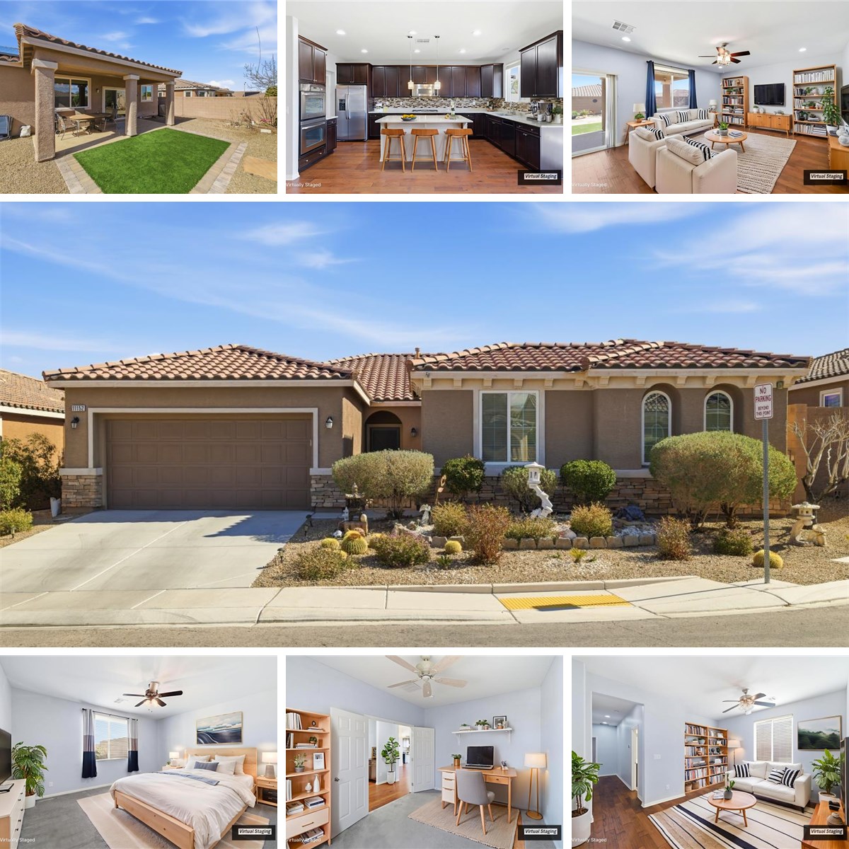 Discover this stunning single story gem in Shutter Ranch Estate, a rare opportunity in a neighborhood of exelusively single-story homes. this immaculate 2,346 sq ft home built in 2014 offers 3 bedrooms, 3 baths, and a versatile den can function as an office, gym or playroom. Enter through a secure gate into a tiled courtyard. Inside, enjoy open layout with wood flooring in the living, dining, and kitchen. The kitchen features granite counters, stainless steel appliances, 42-inch custom cabinets with a garden window, and a huge walk-in pantry. The master suite, separate from the other bedrooms, includes a massive walk-in closet, walk-in shower, and separate tub. Wood flooring complements the carpeted bedrooms. The low-maintenance backyard, a covered patio with tile flooring. Tesla solar panels provide energy savings, and both the AC unit and water heater are nearly new. Located in a quiet, safe neighborhood with convenient access to the Strip and airport—this opportunity won’t last!