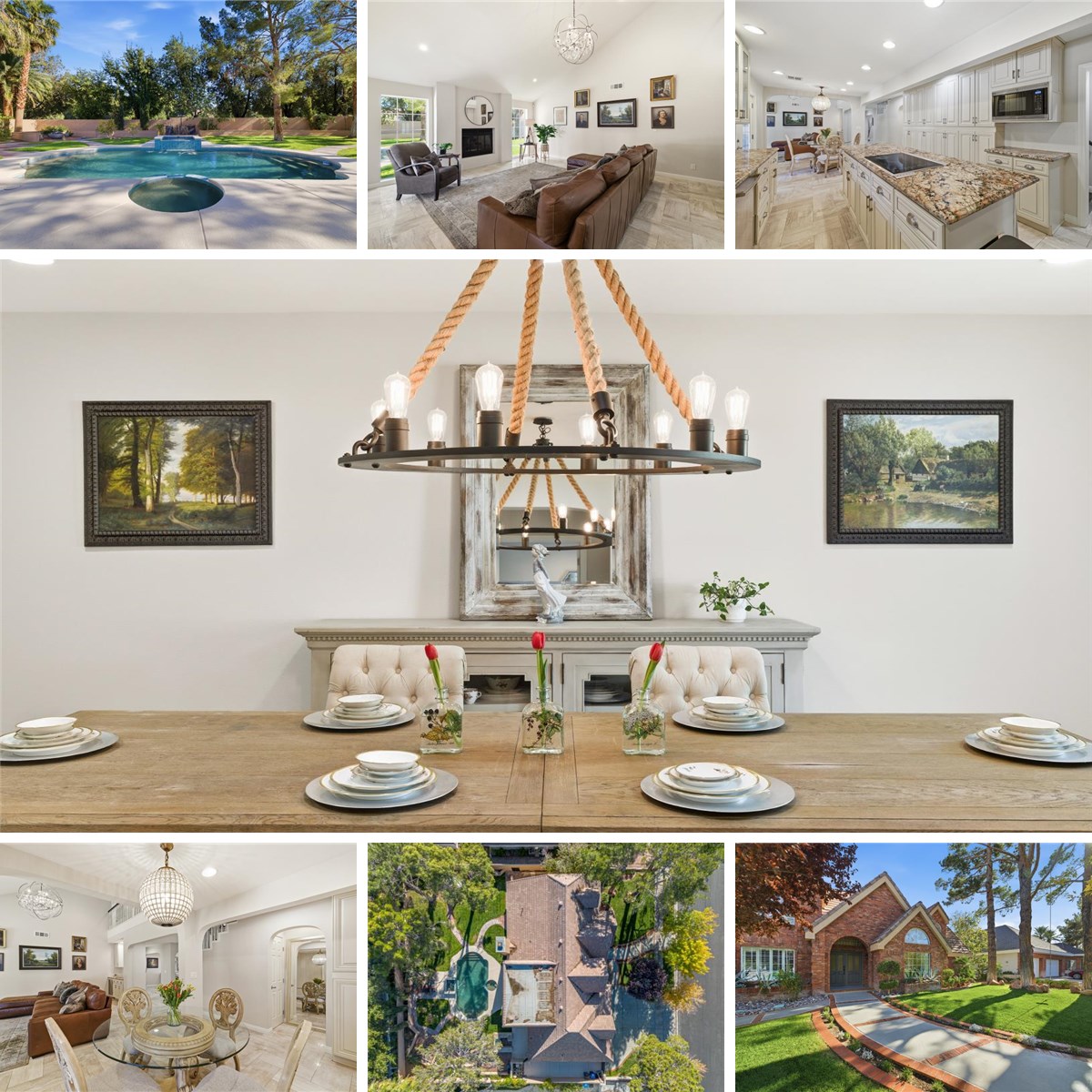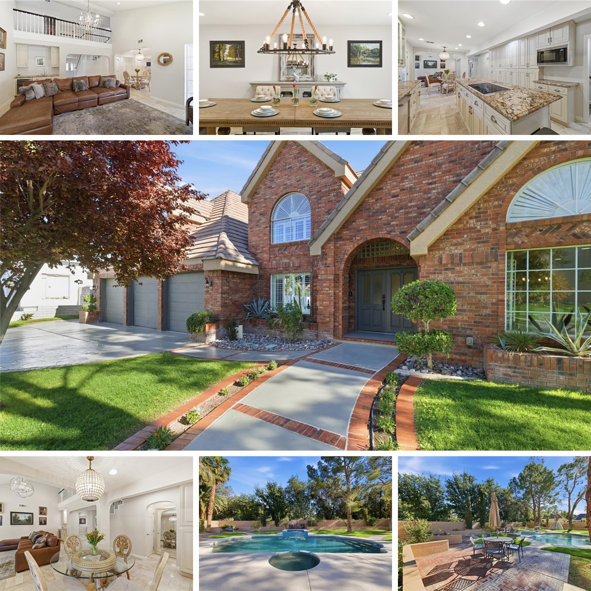 Welcome to a truly unique 3,758 sq ft brick estate in the prestigious guard-gated community of The Fountains. Set on a lush almost 14,000 sq ft lot, this home offers a rare blend of timeless brick front and beautifully landscaped resort style backyard W/sparkling swimming pool & built-in BBQ. Inside, the main-level primary suite provides a sitting area, his&hers closets, direct backyard access. Upstairs, all bedrooms have custom walk-in closets, two-way staircase offers convenient access from Kitchen & entryway. Entertain in the elegant formal dining room or relax in the vaulted-ceiling family room. The chef’s kitchen is equipped with custom cabinetry, Wolf cooktop island, Sub-Zero refrigerator & double Wolf ovens. The Fountains community is known for its exclusivity, top-tier security, and prime location just minutes from shopping, airport & Las Vegas Strip. Enjoy the expansive backyard W/swimming pool and multiple seating areas, making it perfect for both relaxation and entertaining.