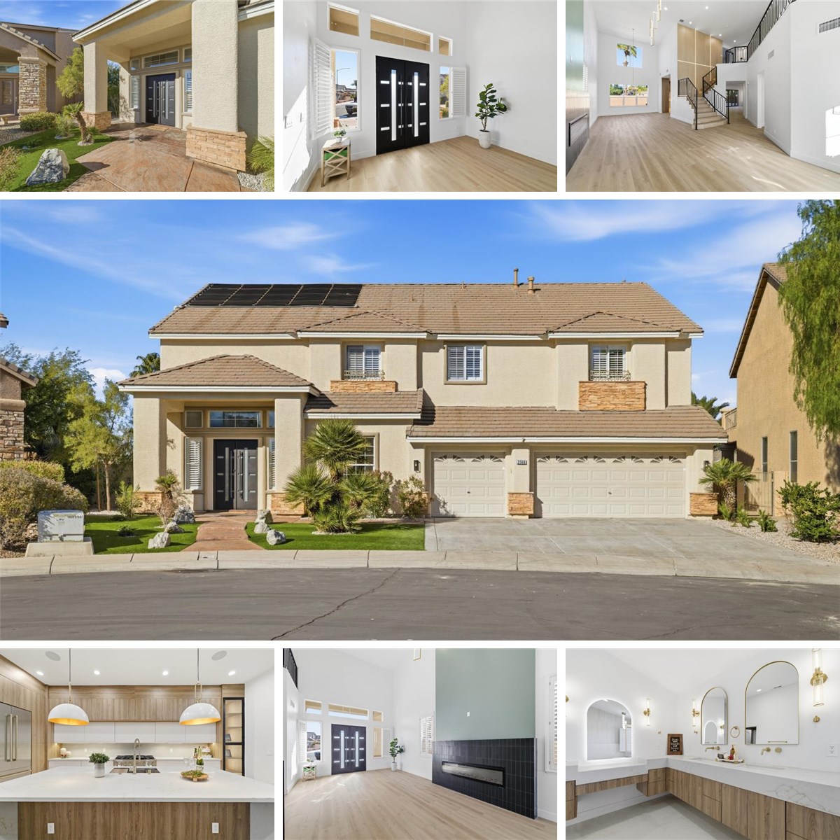 Fully remodeled interior & exterior, this exceptional home offers 5 beds, 3 baths, 3 car garage on a huge lot over 10,000 sq ft, located in a beautiful, gated community near shopping, restaurants, and highly rated schools. The formal living room W/dramatic vaulted ceiling, setting the tone for the refined design throughout. The chef’s kitchen features waterfall island, custom cabinetry, professional-grade appliances including 48” range, double ovens, warming drawers & built-in refrigerator. Architectural details continue W/custom iron staircase and wood-paneled feature wall W/integrated LED lighting. The spa-inspired primary bathroom W/large-format porcelain, curbless shower W/linear drain, wall-mounted brass fixtures, custom vanities, and freestanding tub. The backyard is complete W/a swimming pool, offering space for relaxation & entertaining. Thoughtfully redesigned from top to bottom, this turnkey home combines luxury & functionality in one of Henderson's most desirable locations!